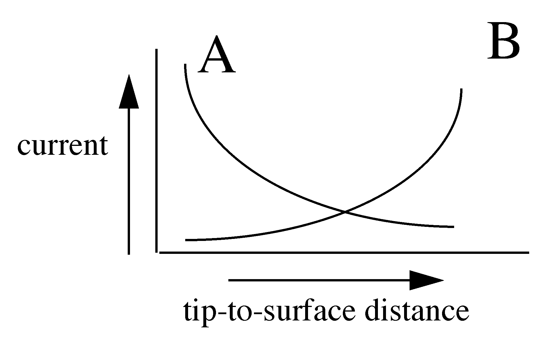 237. Scanning tunneling microscopy depends upon the flow of electricity (current) between a surface and an atomically-sharp probe tip. Two plots of current vs. tip-to-surface distance are shown. Which is correct?