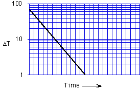 A semilog plot of log [(Temp. of hot water) - (Room temperature)] vs.