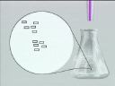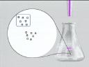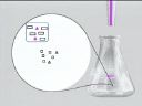 In this animation of an oxidation/reduction titration, at first we see the purple titrant reacting with the colorless sample. The products of this reaction are clear and colorless, so no change takes place in the sample's appearance. When the sample is completely consumed, we are at the equivalence point. When any more titrant is added, the color changes slightly, and we are at the end point. If any more titrant enters the flask, the color darkens and we have overshot the end point.(26)