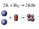 Symbolic and molecular representations of the formation reaction between potassium and bromine to produce potassium bromide.(79)