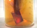 Because of its high reactivity, potassium metal is stored in mineral oil, a relatively inert liquid. The protective coating of mineral oil must be removed from the metal's surface. The soft potassium will then be cut, and a small piece will be picked up with forceps and carefully added to a small beaker of liquid bromine. The large covered beaker prevents the escape of bromine vapor and reaction products into the environment.(36)