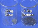 Granular zinc is mixed with iodine and there is no reaction when the two dry solids are mixed together. When water is added to this mixture, there is a reaction approximately as vigorous as the reaction of the manganese with the iodine, showing that zinc and manganese are roughly equivalent in reducing strength, and are stronger than iron and nickel, but not quite as strong as aluminum.(43)