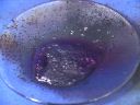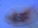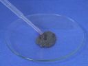 Manganese is mixed with iodine. Notice that the powdered manganese is black, and the iodine is also nearly black. Again there is no reaction just upon mixing the solid materials but as soon as a few drops of water are added, a reaction does take place. Again the reaction is vigorous, but this time there is no flame. By comparison with the aluminum reaction, the manganese reaction was not as vigorous.(43)