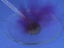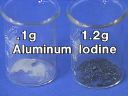 Powdered aluminum and powdered iodine are mixed together and then one or two drops of water are added to the mixture. Shortly after the water is added, a vigorous reaction occurs. There is flame and lots of iodine vapor given off. Some of the iodine vapor can be seen to be reacting to form some other substance because the color is no longer violet but kind of a reddish brown. This vigorous reaction shows that aluminum metal is a fairly strong reducing agent and iodine solid is a fairly strong oxidizing agent.(43)