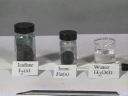 Powdered iron is mixed with some iodine. There is no reaction when the dry solids are mixed together. In this case, adding water initiates a reaction but it is not as vigorous as the reaction of the aluminum or the manganese. Apparently iron is not as strong a reducing agent as these other metals relative to iodine.(43)