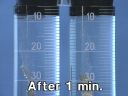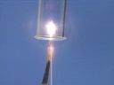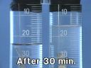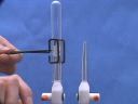 Two cylinders containing sulfuric acid dissolved in water are connected with tubing. When electricity passes through the system, oxidation occurs at one electrode and reduction at the other. Electrolysis of the water generates hydrogen gas at one electrode and oxygen at the other. The role of the sulfuric acid is to allow transfer of charge from one platinum electrode to the other. As the time lapse shows, the volume of gas collected at each electrode differs. The volume of gas generated at each electrode can be determined from the volume readings on the cylinders. When gas from the left cylinder is collected in a test tube and a lighted match is brought near it, the gas ignites with a barking noise, indicating hydrogen. When a glowing match is brought near gas from the right cylinder, the match burns brightly, indicating the presence of oxygen.(32)
