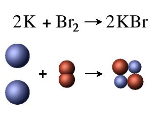 Symbolic and molecular representations of the formation reaction between potassium and bromine to produce potassium bromide.