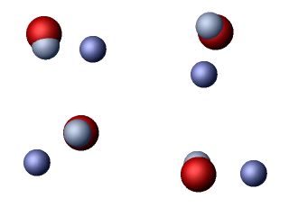This represents a sodium hydroxide solution. The blue-grey balls are sodium ions. Hydroxide ions are represented by a grey ball (hydrogen) next to a red ball (oxygen).