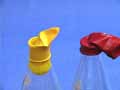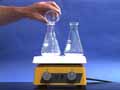 Water is poured into the left one of two Erlenmeyer flasks on a hot plate. The heat is turned on. Eventually the water boils, filling the left flask with water vapor. Balloons are mounted onto the tops of the flasks and the flasks are removed from the hot plate. The still expanding steam causes the left balloon to stand upwards. As the gas in the balloons cools, the balloon on the left collapses.