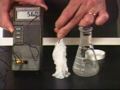A supersaturated solution of sodium acetate is poured onto one small sodium acetate crystal. Crystals form from the liquid immediately upon contact with the seed crystal. A thermometer shows that the crystallization process is exothermic. A chemical hot pack is shown as an example of a commercially available supersaturated solution.