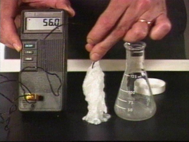 The probe from a digital thermometer touches the solid sodium acetate to test the temperature. It is seen that the material is quite warm. The process of crystallization is an exothermic process in which heat is given off to the surroundings. The crystallization occurred rapidly once a seed crystal was available. The seed crystal provides a structure around which the ions of sodium acetate could form a solid crystal lattice.