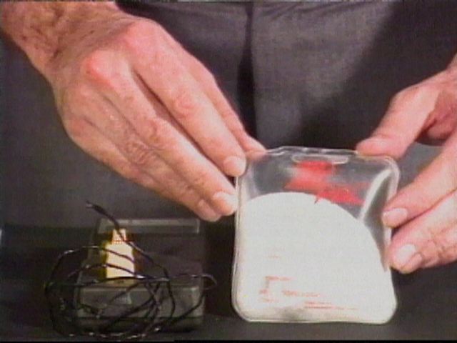 Now a commercial application of this crystallization process is shown. A metal disc is manipulated inside a sealed plastic bag holding the sodium acetate solution. This causes the sodium acetate to crystallize. The digital thermometer shows that the temperature of the heating pack has gone up significantly from room temperature. This heating pack provides an easily portable method of having heat available whenever and wherever it is needed.