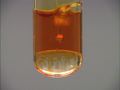 When chlorine gas is bubbled into an aqueous solution of potassium bromide, some of the bromide ions are oxidized to bromine. Some of the bromine molecules combine with bromide ions to form tribromide ion, Br3-. In this demonstration, the aqueous solution is above a layer of carbon tetrachloride, in which bromine is quite soluble. The red-brown color of bromine can be seen as the bromine dissolves in the carbon tetrachloride layer.