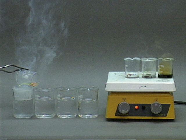 Pieces of copper are added to hot concentrated solutions of hydrochloric, phosphoric, sulfuric and nitric acids. A reaction clearly takes place between copper and nitric acid.