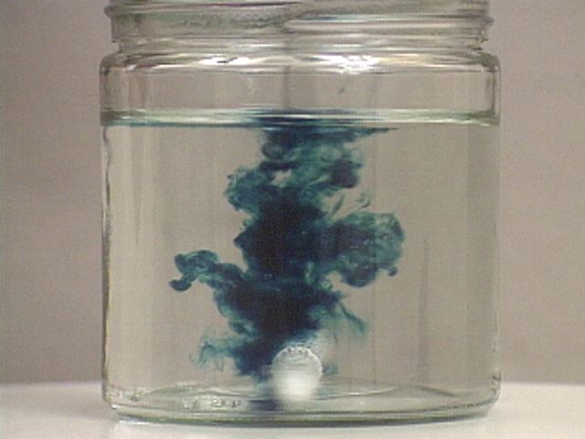 When a colored drop of liquid is stirred, its molecules are dispersed throughout the solution. The process is shown in reverse. Blue molecules in a partially mixed aqueous solution "reassemble" into drops of dye on the surface of the water. The situation shown is so highly improbable that we would not expect to observe it in nature.