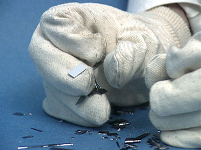 When a silicon wafer is shattered, the pieces are no longer connected. The process is shown in reverse. The shattered pieces of a silicon wafer "assemble themselves" back into the original wafer. The situation shown is so highly improbable that we would not expect to observe it in nature.