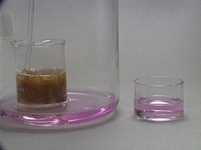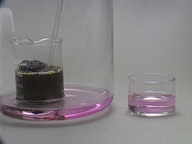 In a second experiment, the sulfur dioxide reduces purple permanganate to nearly colorless manganese(II).