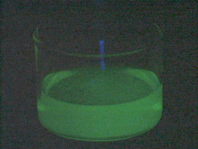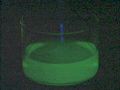 A buffered luminol solution with a copper(II) catalyst is added to the funnel on the left. A hydrogen peroxide solution is added to the funnel on the right. On releasing the rubber tubing the solutions mix. The chemical reaction generates energy which is seen as blue light. This process is chemiluminescence. When the reacting solution mixes with a dye, fluorescein, the light energy from the reaction causes the fluorescein to give off a greenish light in a process called fluorescence.