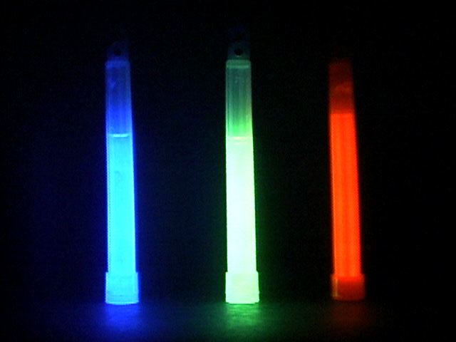 Commercially available light sticks contain a solution in a glass vial. When the vial is broken, a second solution mixes with the first and light is generated. Different dyes give off different colors when they are caused to fluoresce by the light of the chemiluminescent reaction. Light sticks give off light from 3 to 8 hours, depending on the concentrations of reactants.