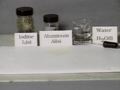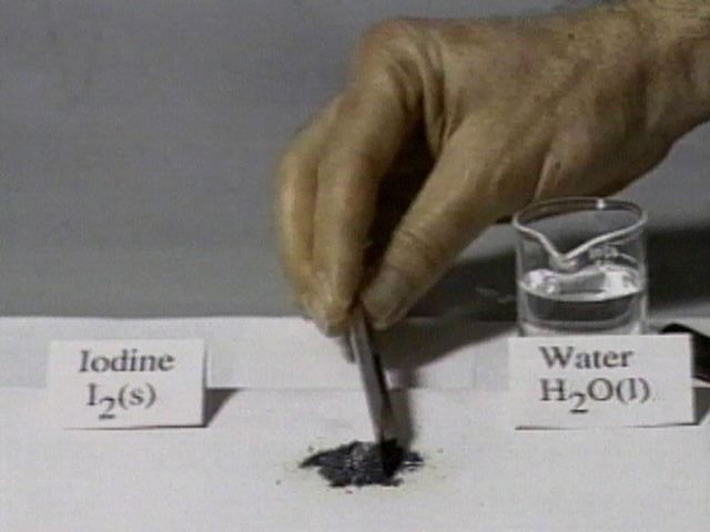 Powdered iron is mixed with some iodine. There is no reaction when the dry solids are mixed together. In this case, adding water initiates a reaction but it is not as vigorous as the reaction of the aluminum or the manganese. Apparently iron is not as strong a reducing agent as these other metals relative to iodine.