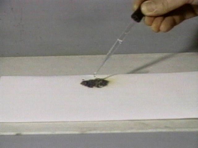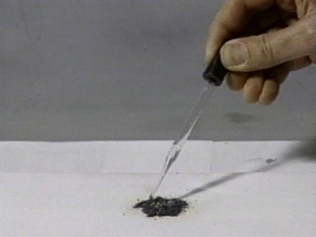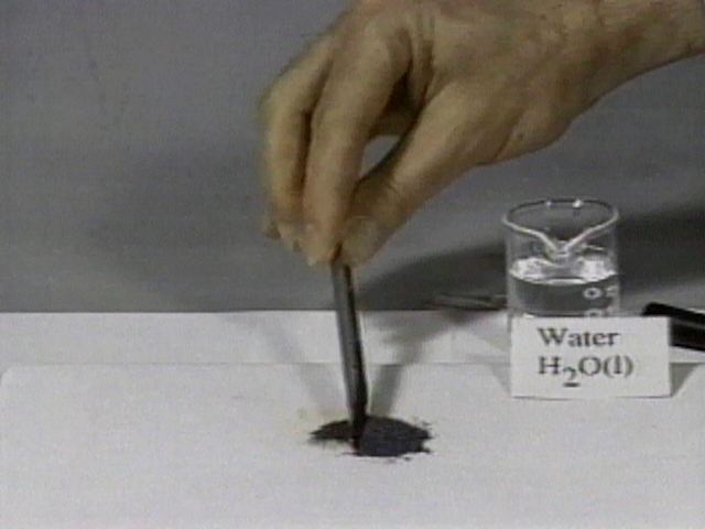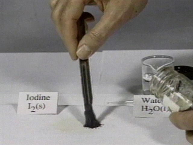Manganese is mixed with iodine. Notice that the powdered manganese is black, and the iodine is also nearly black. Again there is no reaction just upon mixing the solid materials but as soon as a few drops of water are added, a reaction does take place. Again the reaction is vigorous, but this time there is no flame. By comparison with the aluminum reaction, the manganese reaction was not as vigorous.