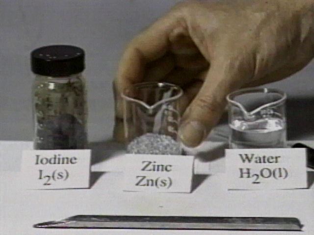Granular zinc is mixed with iodine and there is no reaction when the two dry solids are mixed together. When water is added to this mixture, there is a reaction approximately as vigorous as the reaction of the manganese with the iodine, showing that zinc and manganese are roughly equivalent in reducing strength, and are stronger than iron and nickel, but not quite as strong as aluminum.