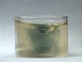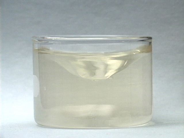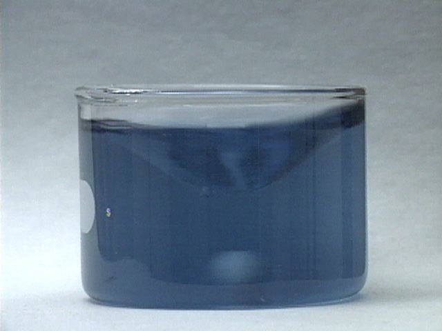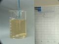 The reaction is repeated without stirring. As a result, the color oscillations are not uniform throughout the mixture. The color change appears to move through the mixture like a wave. The formation of gas bubbles also oscillates.
