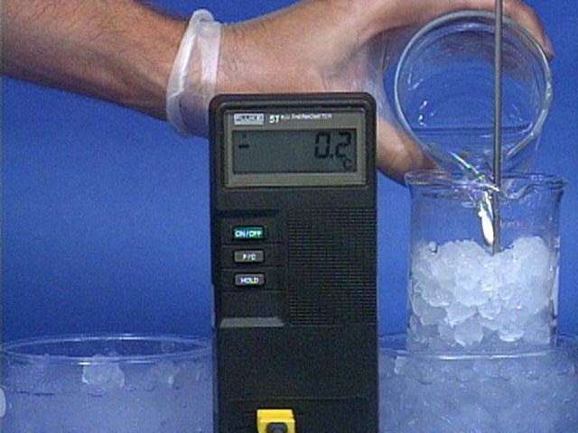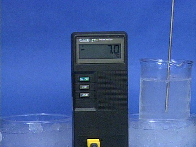 Dissolving sulfuric acid in water is an exothermic process. When sulfuric acid is mixed with ice this exothermic process causes the temperature to rise at first, but as more of the ice melts, the temperature falls. Because a sulfuric acid solution has a lower freezing point than water, the temperature can fall below 0 degrees Celsius if enough ice is present.The following are additional pictures relating to the first movie.