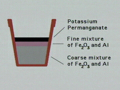 A diagram shows the layers of solids within a ceramic pot prior to this reaction. Glycerin is added to potassium permanganate at the top of a ceramic pot containing aluminum metal and iron oxide. When ignited by the glycerin/permanganate reaction, the aluminum/iron oxide mixture reacts vigorously and spectacularly, producing molten iron and aluminum oxide. The equation for the reaction is given.