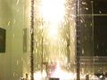The thermite reaction involves a mixture of iron oxide and aluminum that has been placed in a flower pot and covered with potassium permanganate. Some glycerin is poured over the potassium permanganate and eventually begins to react. When the iron oxide-aluminum mixture is ignited, a very vigorous reaction occurs and a molten metal can be seen dropping from the flower pot into a bucket of sand below. The reaction is extremely exothermic, a great deal of heat is given off. When the product of the reaction is examined a large piece of white hot iron has fallen into the sand at the bottom of the apparatus. This illustrates that aluminum is an extremely strong reducing agent and also that this reaction is very highly exothermic.