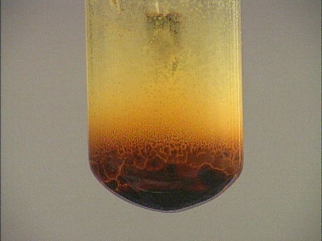 Reaction of Chlorine with Iodine Still Images Iodine crystals are placed at the bottom of a capillary tube. Chlorine gas is passed through the iodine crystals. The initial reaction between the chlorine and iodine forms iodine monochloride. The brown vapor of iodine monochloride can be seen flowing from the capillary. Dark brown iodine monochloride liquid is collected at the bottom of the test tube. As more chlorine is added, the brown iodine monochloride forms crystals of yellow iodine trichloride. You can get at large JPEG versions of the images by means of the following links. 0 1 2 3 4 5 6 7 8 9 10 11 12 13 14 15 16 17 18 19 Back to the topic