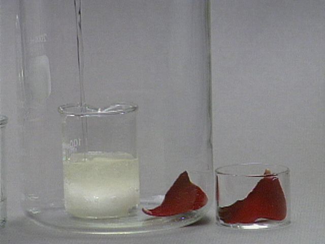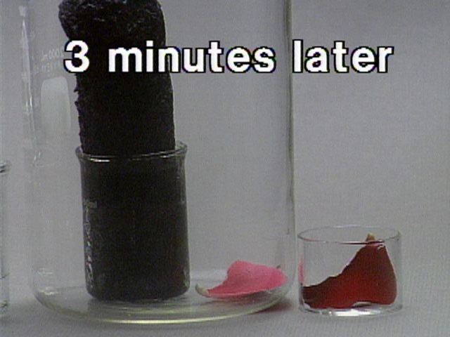 Formation of Carbon from Carbohydrate - With a Rose Petal Still Images Concentrated sulfuric acid is added to table sugar, sucrose, which had previously been mixed with water. The sulfuric acid dehydrates the sugar, a carbohydrate. The sugar turns brown due to the removal of water in this caramelization process. The remaining black solid contains mostly carbon. Steam generated in this exothermic process causes the solid mass to expand. Sulfuric acid also acts as an oxidizing agent, and is reduced to sulfur dioxide. A rose petal is bleached by the sulfur dioxide. You can get at large JPEG versions of the images by means of the following links. 0 1 2 3 4 5 6 7 8 9 10 11 12 13 14 15 16 17 18 19 20 Back to the topic