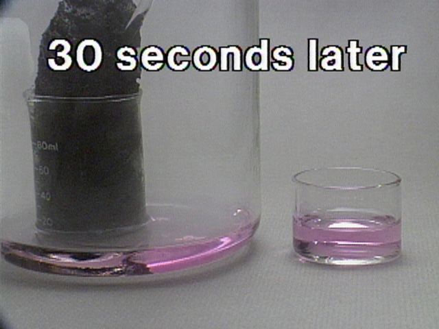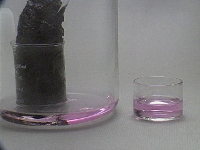 Formation of Carbon from Carbohydrate - With Permanganate Still Images Concentrated sulfuric acid is added to table sugar, sucrose, which had previously been mixed with water. The sulfuric acid dehydrates the sugar, a carbohydrate. The sugar turns brown due to the removal of water in this caramelization process. The remaining black solid contains mostly carbon. Steam generated in this exothermic process causes the solid mass to expand. Sulfuric acid also acts as an oxidizing agent, and is reduced to sulfur dioxide. The sulfur dioxide reduces dissolved purple permanganate to nearly colorless manganese(II). You can get at large JPEG versions of the images by means of the following links. 0 1 2 3 4 5 6 7 8 9 10 11 Back to the topic