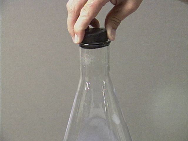 Reaction of Nitrogen Monoxide with Oxygen to form Nitric Acid Still Images A flask containing dissolved bromphenol blue indicator is filled with nitrogen monoxide, a colorless gas. When the stopper is loosened, air diffuses into the flask and oxygen reacts with the nitrogen monoxide to form nitrogen dioxide, a brown gas. The nitrogen dioxide dissolves in the solution, creating a partial vacuum within the flask. The resulting pressure difference draws more oxygen into the flask when the stopper is loosened, forming more NO2. Upon dissolving, the nitrogen dioxide reacts with water to form nitric acid, as indicated by the color change of the solution. As more brown nitrogen dioxide forms, more of the gas dissolves, increasing the acidity of the solution. You can get at large JPEG versions of the images by means of the following links. 0 1 2 3 4 5 6 7 Back to the topic