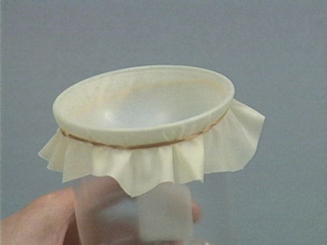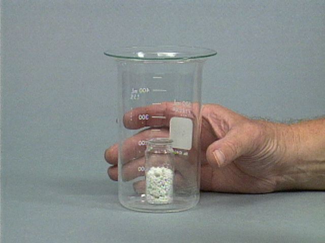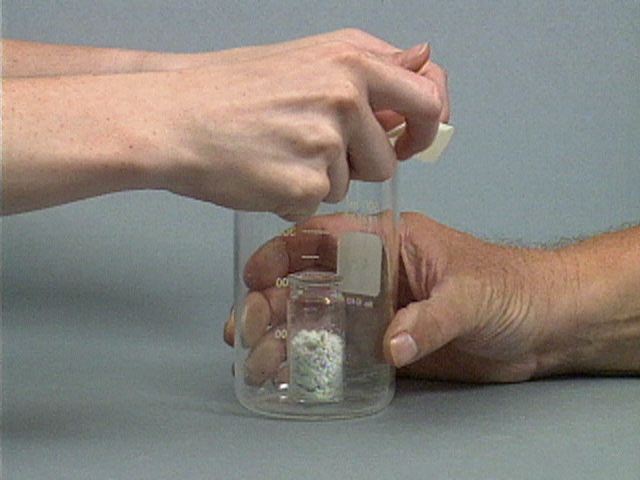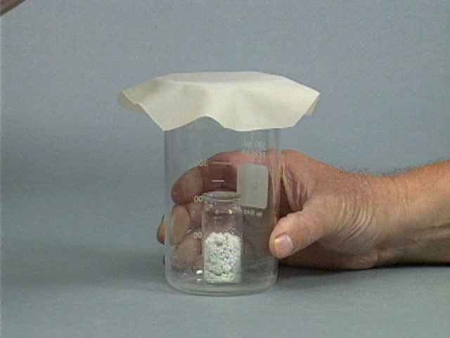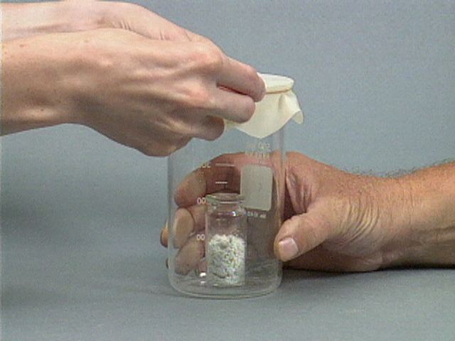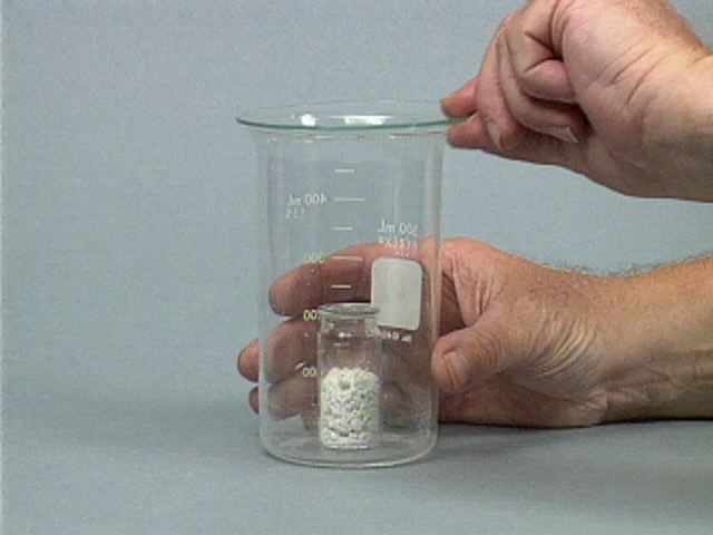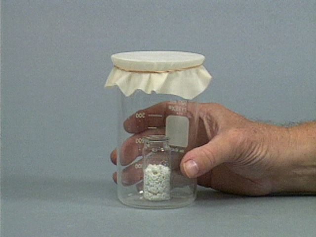 A large beaker contains a covered vial of soda lime, which is a damp mixture of sodium hydroxide and calcium oxide. Sulfur dioxide gas is added to the beaker and the top of the beaker is sealed with a rubber dam. The vial is tipped over, so the soda lime can mix with the sulfur dioxide. The reaction of the calcium oxide with sulfur dioxide creates solid calcium sulfite, decreasing the number of gas particles and thus the pressure within the beaker, so the dam is pushed inward by atmospheric pressure.