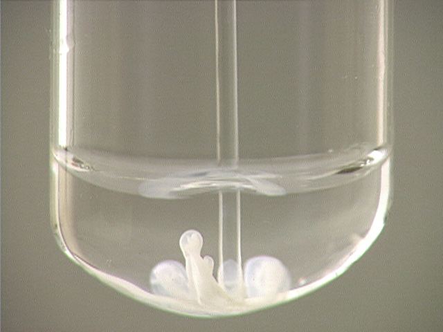 Here, sodium bromide (NaBr) is added to silver nitrate (AgNO3). The result is a white precipitate.