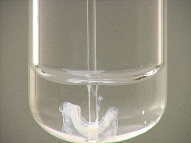 Here, sodium chloride (NaCl) is added to silver nitrate (AgNO3). The result is a white precipitate.