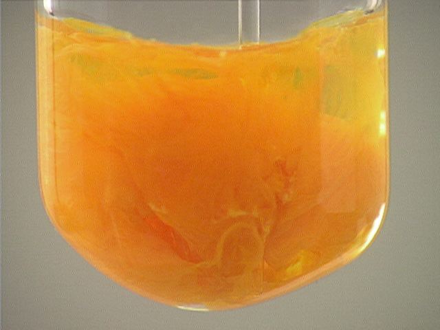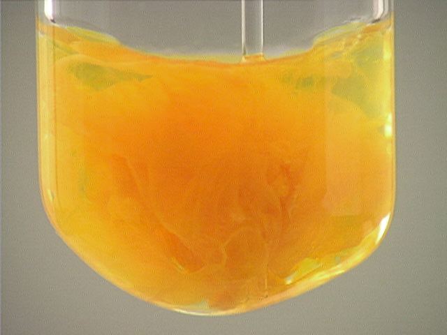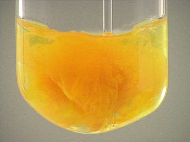 Here, sodium sulfide (Na2S) is added to cadmium nitrate (Cd(NO3)2). The result is a deep yellow-orange precipitate.