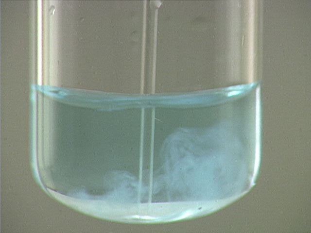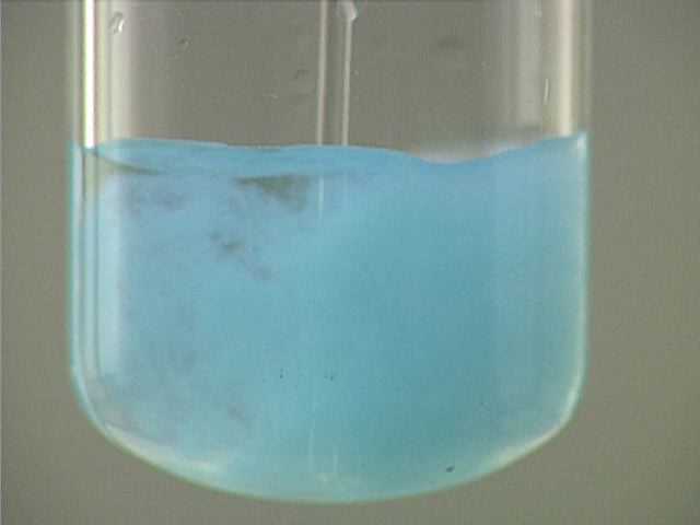 Here, sodium carbonate (Na2CO3) is added to copper(II) nitrate (Cu(NO3)2). The result is a blue precipitate.