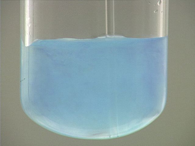 Here, ammonia (NH3) is added to copper(II) nitrate (Cu(NO3)2). The result is a pale blue precipitate, which is Cu(OH)2(s). The dark blue color is due to Cu(NH3)4 2+ .