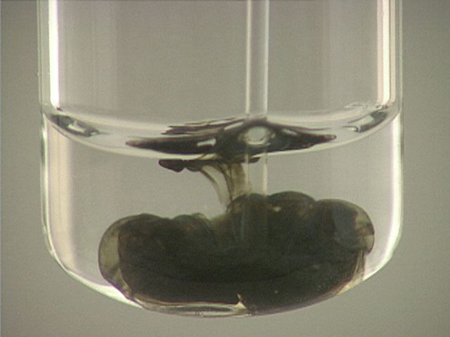 Here, sodium sulfide (Na2S) is added to mercury(I) nitrate (Hg2(NO3)2). The result is a black precipitate.