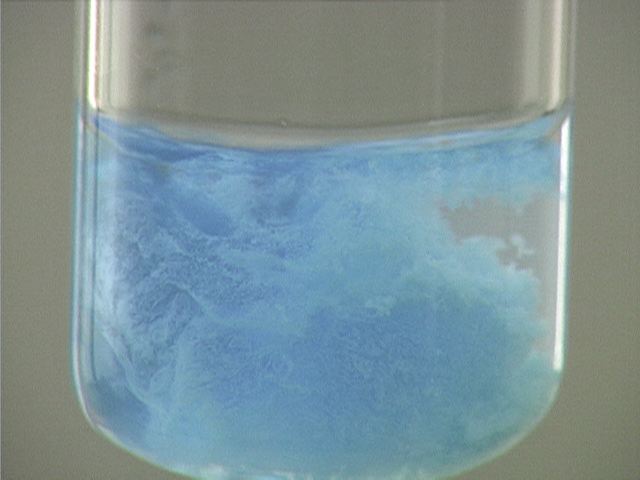Here, copper(II) sulfate (CuSO4) is added to sodium hydroxide (NaOH). The result is a blue precipitate.