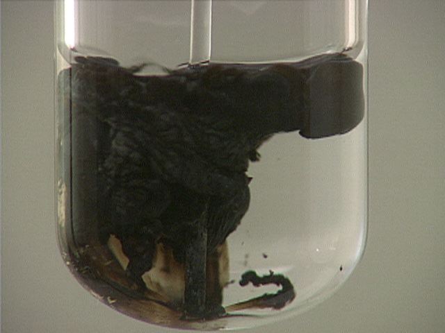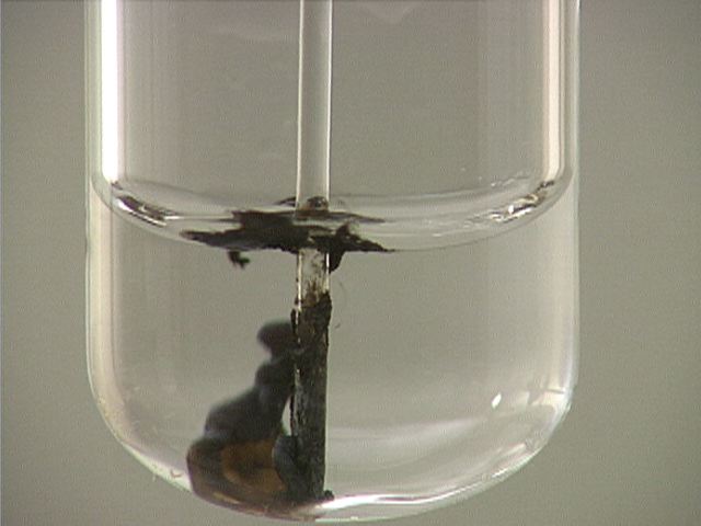 Here, sodium sulfide (Na2S) is added to lead(II) nitrate (Pb(NO3)2). The result is a thick black precipitate.