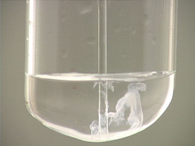 Here, sodium carbonate (Na2CO3) is added to lead(II) nitrate (Pb(NO3)2). The result is a white precipitate.