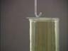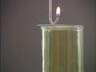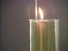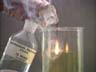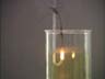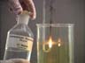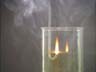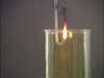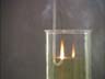 Natural gas flowing from a capillary is ignited. The watch glass covering a glass cylinder of chlorine is removed and the methane flame lowered. The reaction between methane and air is replaced by the reaction between methane and chlorine, which produces carbon, hydrogen chloride and various chlorocarbons. As the flame burns the level of chlorine gas in the container decreases. When a stopper from a bottle of aqueous ammonia is brought near the flame, white fumes of ammonium chloride are produced indicating the presence of hydrogen chloride.