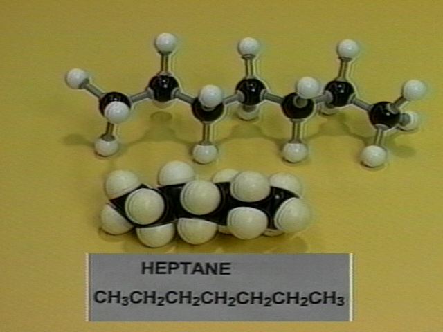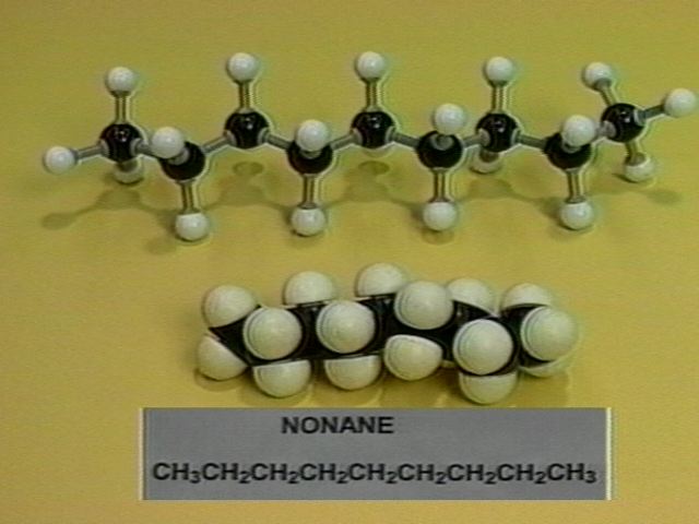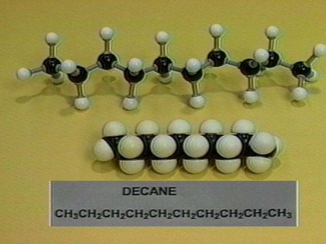 Molecular models of straight-chain alkanes with 5-10 carbon atoms are shown.