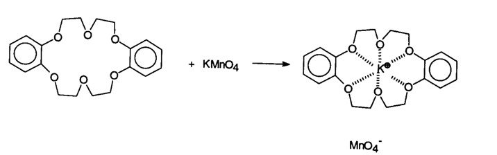 Solid potassium permanganate is added to benzene. The ionic solid does not dissolve in the nonpolar organic liquid. When the crown ether 18-dibenzo-crown-6 is added, the potassium permanganate dissolves forming a purple solution. The crown ether forms a host-guest complex with potassium ion, and the resulting complex is soluble in benzene.