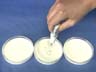 Milk is poured into three petri dishes. Rennin, a protease, is added to two of the samples to curdle the milk. Calcium chloride is added to one of the samples.