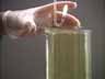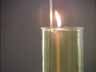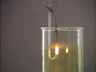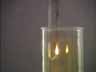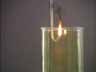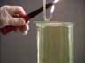 Natural gas flowing from a capillary is ignited. The watch glass covering a glass cylinder of chlorine is removed and the methane flame lowered. The reaction between methane and air is replaced by the reaction between methane and chlorine, which produces carbon, hydrogen chloride and various chlorocarbons. As the flame burns the level of chlorine gas in the container decreases. When a stopper from a bottle of aqueous ammonia is brought near the flame, white fumes of ammonium chloride are produced indicating the presence of hydrogen chloride.