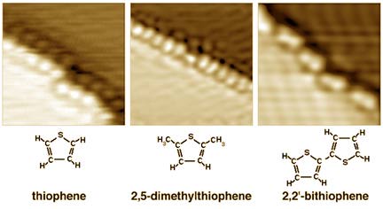 By performing this experiment in the controlled environment of a vacuum chamber (see Figure 5) it is possible to ensure that only bithiophene molecules come into contact with a clean silver surface. You can then observe that the molecules bond only along an atomic step on the surface as shown in Figures 6a and b. Other molecules attach to the silver surface in a similar way, as shown in Figure 6c.
